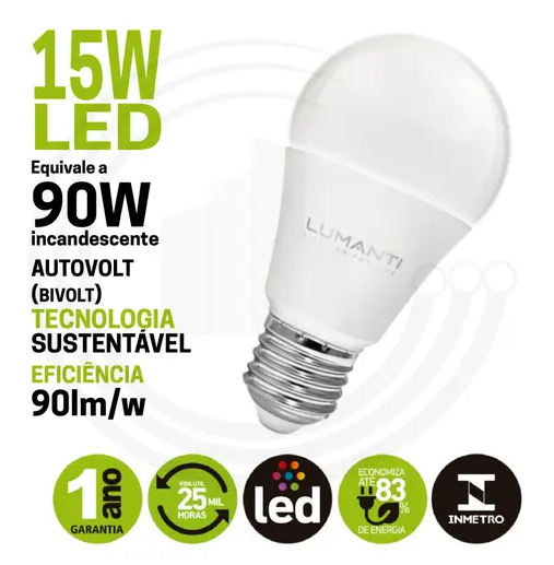 A lâmpada Bulbo LED 15W da Lumanti é a escolha ideal para quem busca economia, durabilidade e alto desempenho luminoso. Fabricada em policarbonato resistente, oferece fluxo de até 1311 lúmens, com variações de temperatura de cor entre 3000K (quente), 4000K (neutra) e 6500K (branca fria). Seu ângulo de abertura de 200° garante uma excelente distribuição de luz, perfeita para ambientes residenciais e comerciais.